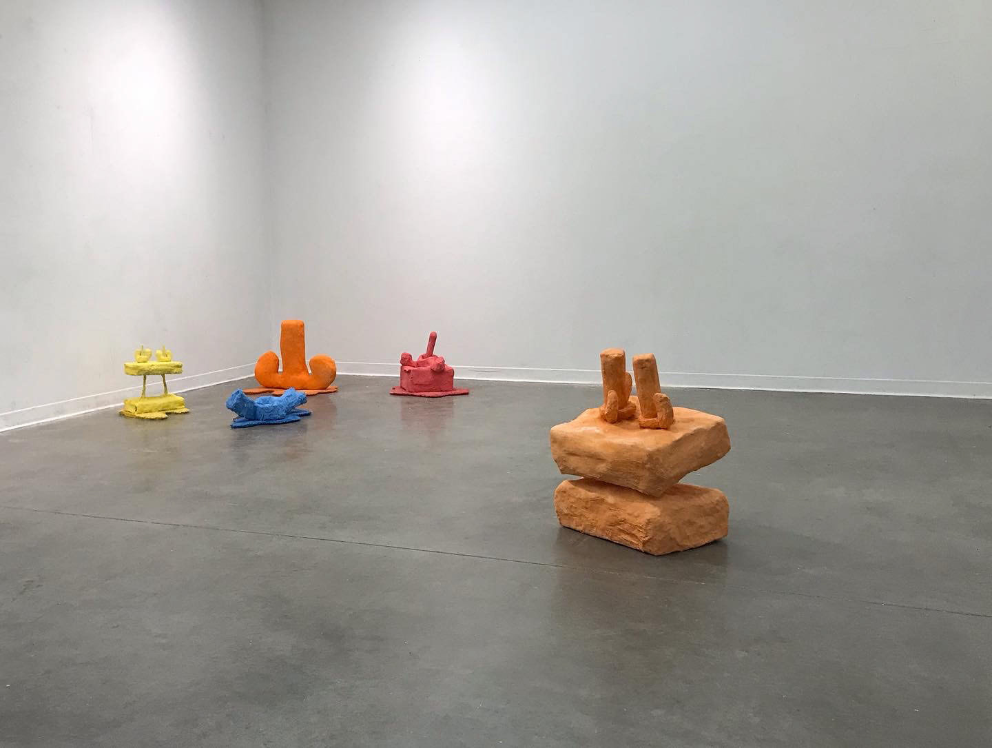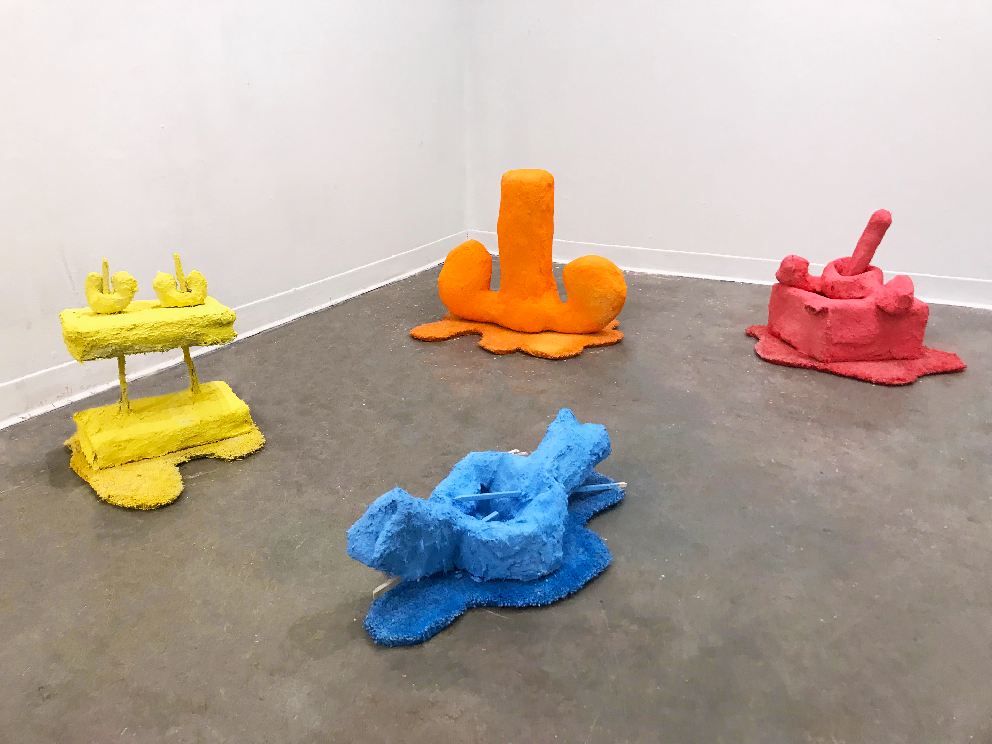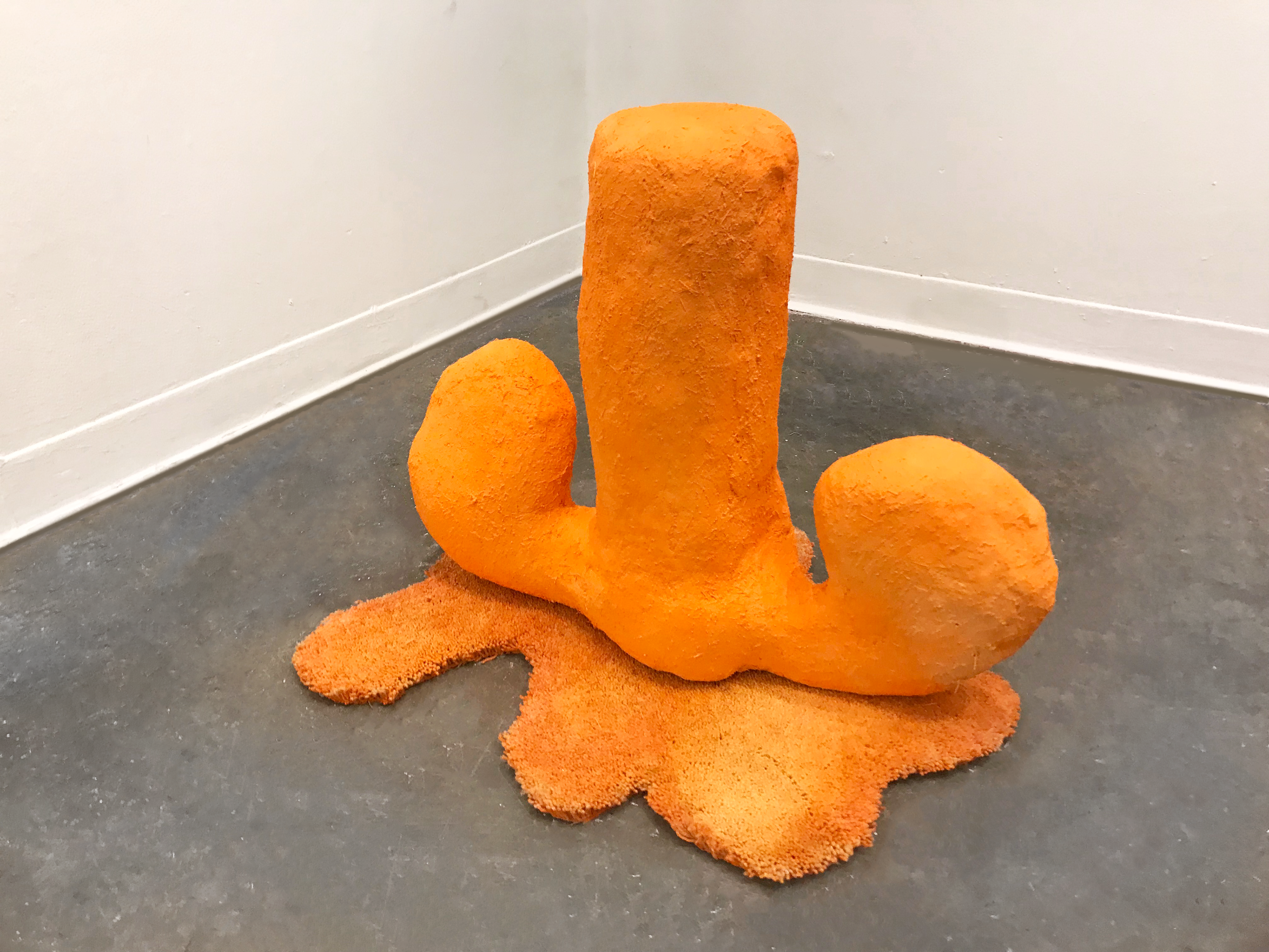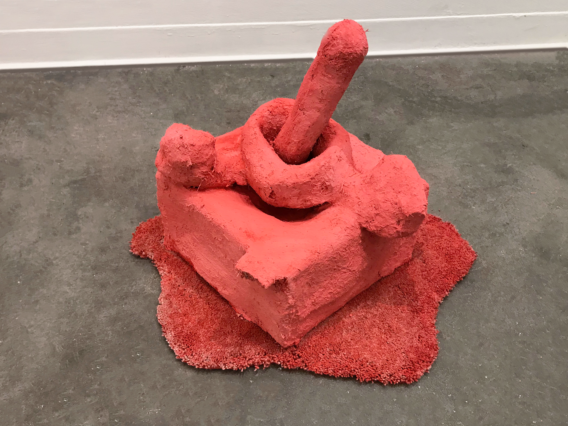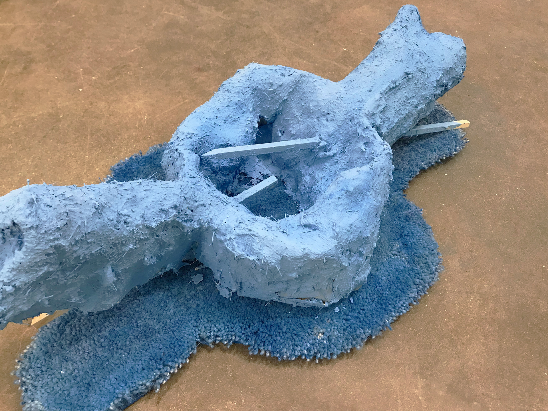 cardboard, paper waste, joint compound, craft glue, anchoring cement, fiberglass, found carpet, wood, acrylic paint